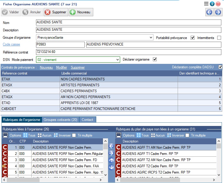 Désormais, les blocs versement S21.G00.20 ne sont générés que si sur la fiche organisme le mode de paiement sélectionné est 03:Prélèvement