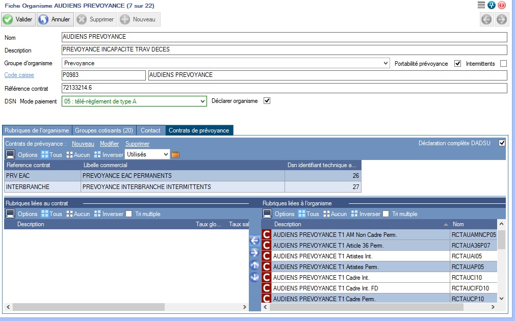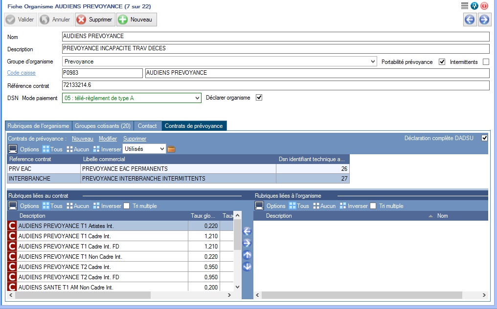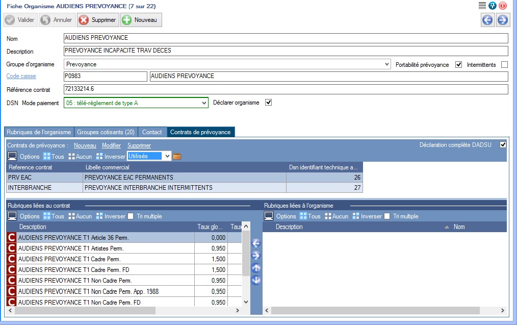 Ouvrez l'organisme Thalie Santé et cochez les case (Déclarer organisme et Générer bloc de versement) sur la fiche organisme pour la déclaration en dsn, SI vous êtes concerné par cette cotisation (anciennement CMB)