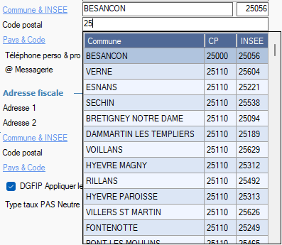 Lors de la saisie dans une zone d'adresse (Commune,CP,Pays); une zone de liste déroulante apparait en dessous, filtrée en fonction de ce que vous saisissez